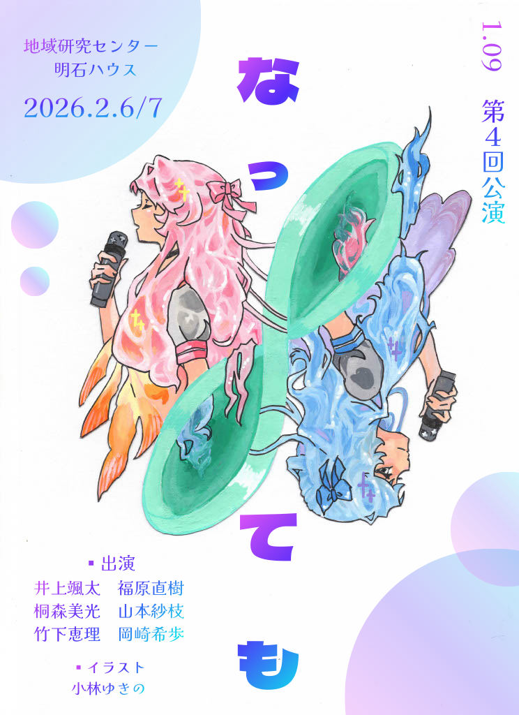 今回は、4回生岡崎希歩さんが主宰するグループ「1.09」による公演を明石ハウスで行います。みなさまのご来場を心待ちにいたしております。