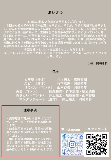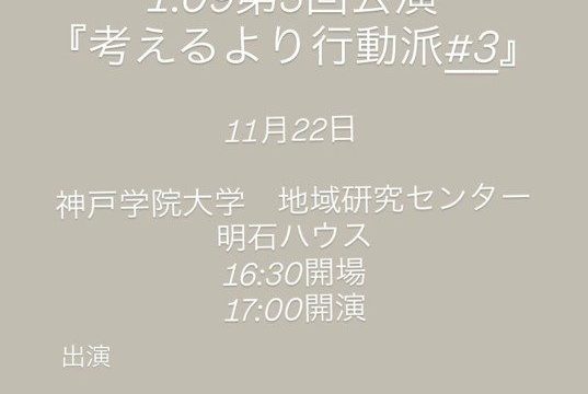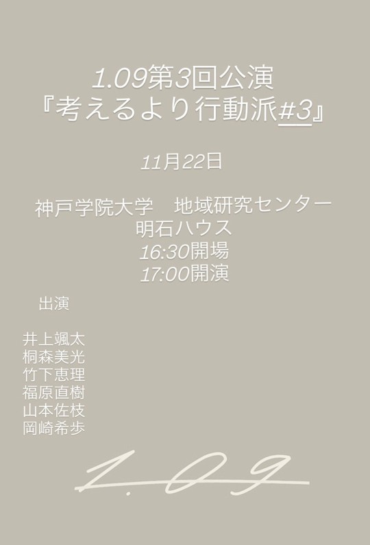 今回は、4回生岡崎希歩さんが主宰するグループ「1.09」が、明石ハウスで漫才とコントを披露します。みなさまのご来場を心待ちにいたしております。