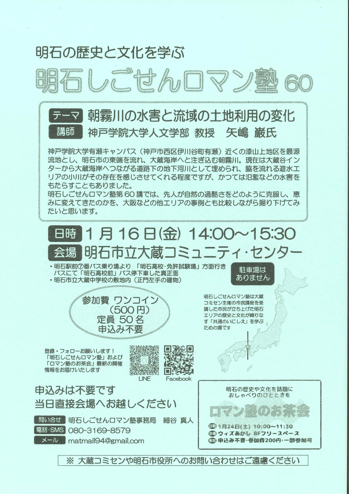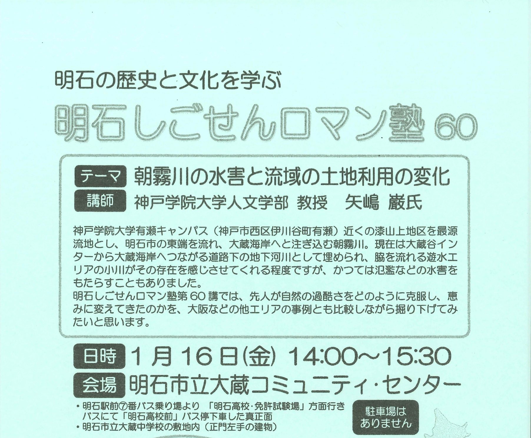 地域研究センター研究員の矢嶋巌教授が、明石しごせんロマン塾で講演を行います お知らせ 2025.12.24 明石市立大蔵中学校内にある「大蔵コミュニティ・センター」で、明石の歴史と文化を学ぶ『明石しごせんロマン塾第60講』が開催されます。地域研究センター研究員の人文学部矢嶋巌教授が講演を行います。 テーマ:朝霧川の水害と流域の土地利用の変化日 時:2026年1月16日(金)14:00~15:30会 場:明石市立大蔵コミュニティ・センター(明石市立大蔵中学校敷地内)定 員:50名 申し込み不要参加費:500円 詳細は↓チラシをご覧ください。