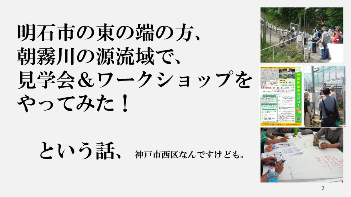矢嶋教授はブースBの第1発表者として登壇しました。今年6月1日に本学地域研究センターと明石市の朝霧校区まちづくり協議会が合同開催した見学会&ワークショップ「朝霧川源流を訪ねてー朝霧川源流域の自然・歴史・暮らしを探求―」で各教員が行った解説の一部を抜粋して発表しました。明石市東部を流れる朝霧川の上流域である本学有瀬キャンパス周辺の漆山地区の自然環境や人びとの暮らし、歴史や民俗、本学の第1グラウンドや図書館新館下の新池が果たしている遊水地機能、森茂樹初代学長が自らと母わさが生まれた淡路島を望む漆山の地に神戸学院大学を設置したことなどを、「いつものあの川」である朝霧川の「源流に詰まってた歴史ロマン」として紹介し、ブースに集まったオーディエンスから盛んな拍手を受けていました。