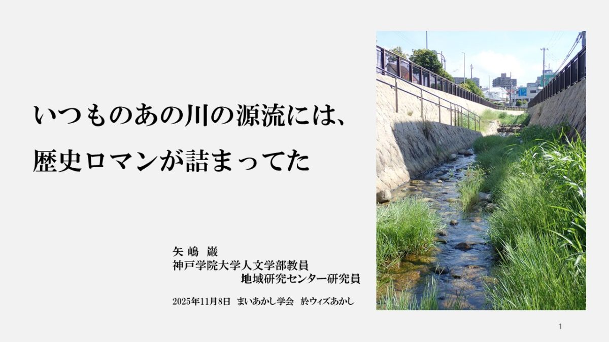 2025年11月8日(土)に、明石市のアスピアあかし8階にある複合型交流拠点ウィズあかしで開催された、第1回まいあかし学会に、19組の発表者の一人として人文学部の矢嶋巌教授が参加し、「いつものあの川の源流には歴史ロマンが詰まってた」と題する「まいあかしネタ」を発表しました。