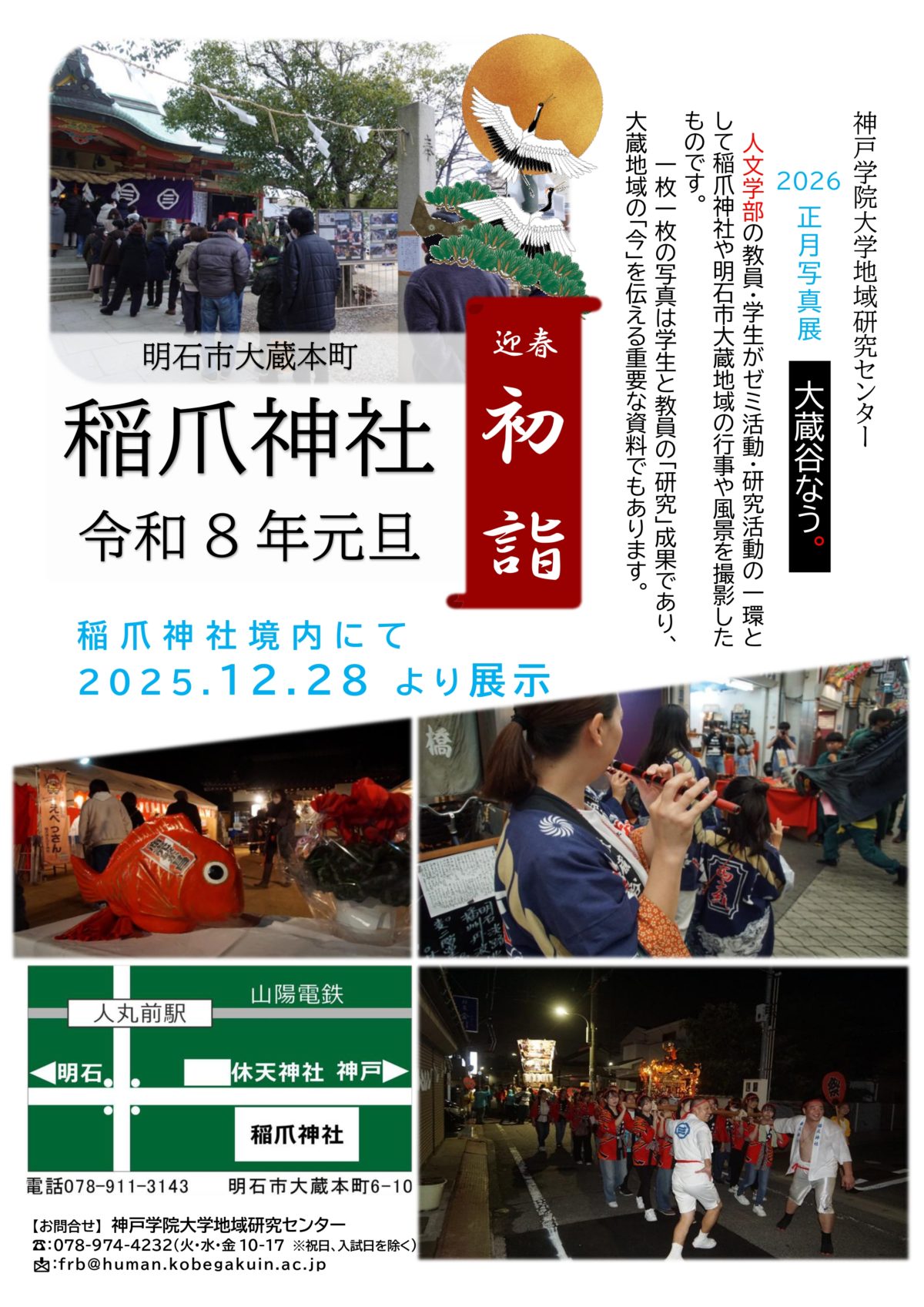 12/28より明石市稲爪神社で恒例のフィールドワーク写真展を開催いたします お知らせ 2025.12.23 2025年12月28日より明石市稲爪神社にて地域研究センター・人文学部による恒例の写真展を開催いたします。 展示写真は、人文学部の教員・学生がゼミ活動・研究活動の一環として稲爪神社や明石市大蔵地域の行事や風景を撮影したものです。一枚一枚の写真は学生と教員の「研究」成果であり、大蔵地域の「今」を伝える重要な資料でもあります。 「地域と繋がる大学」の実践である写真展を多くの方にご覧になっていただけると幸いです。ご来場をお待ちしております。
