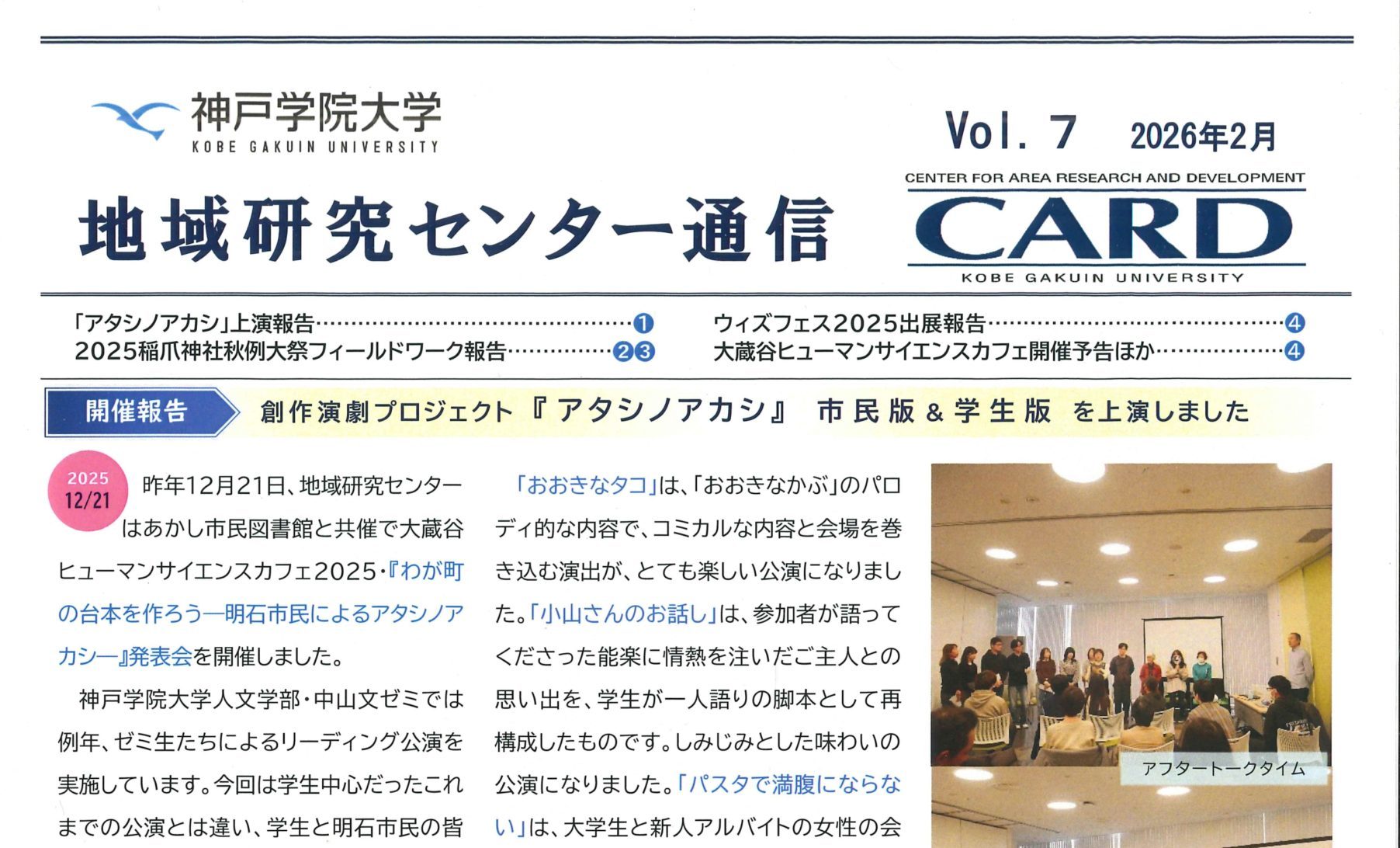 地域研究センター通信 第7号を刊行しました お知らせ 2026.02.10 2026.02.03 地域研究センター通信第7号を発刊しました。主な内容は以下の通りです。 ◆創作演劇プロジェクト 『アタシノアカシ』 の上演報告、◆2025稲爪神社秋例大祭フィールドワーク報告、◆稲爪神社秋例大祭写真紹介、◆ウィズフェス2025への出展報告、◆2025年度地域研究センター活動・研究報告書刊行予告、◆大蔵谷ヒューマンサイエンスカフェ2025の開催予定 ぜひご高覧ください。
