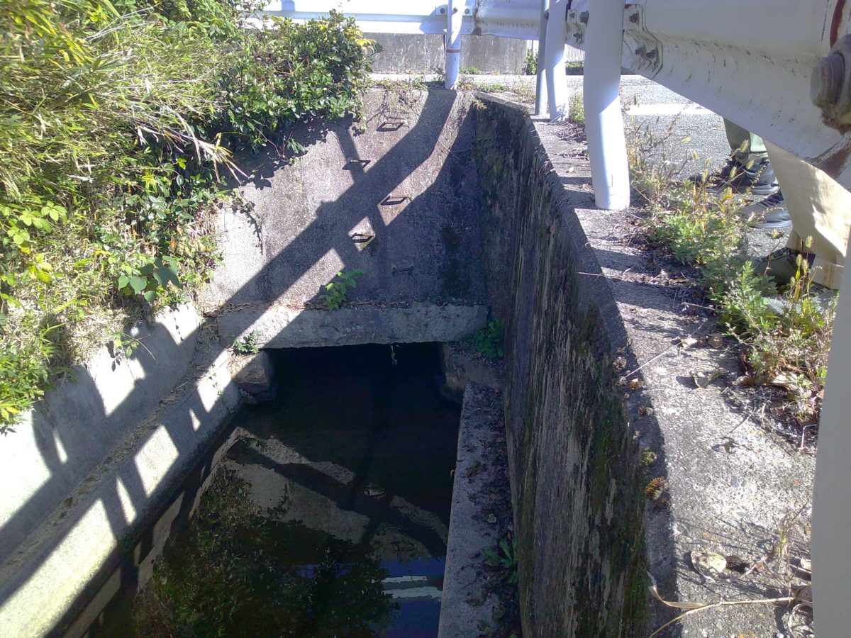 掘割が福知川を過ぎるあたりから印路地域(神戸市西区平野町)に入ります。山中から明石川へと注ぐ福知川は、林崎掘割とほぼ直角に交差するため、福知川の川底をくぐるようにして掘割が流れています(前川橋付近)。この仕組みを「伏樋」といい、江戸時代の資料によると林崎掘割の流域数ヶ所に設置されたようですが、現在ではおそらく福知川に残るのが唯一の例でしょう。石造りのトンネル(暗渠)のようになっており、すでに江戸時代から、耐久性を考慮して石製が採用されていたとのことです。