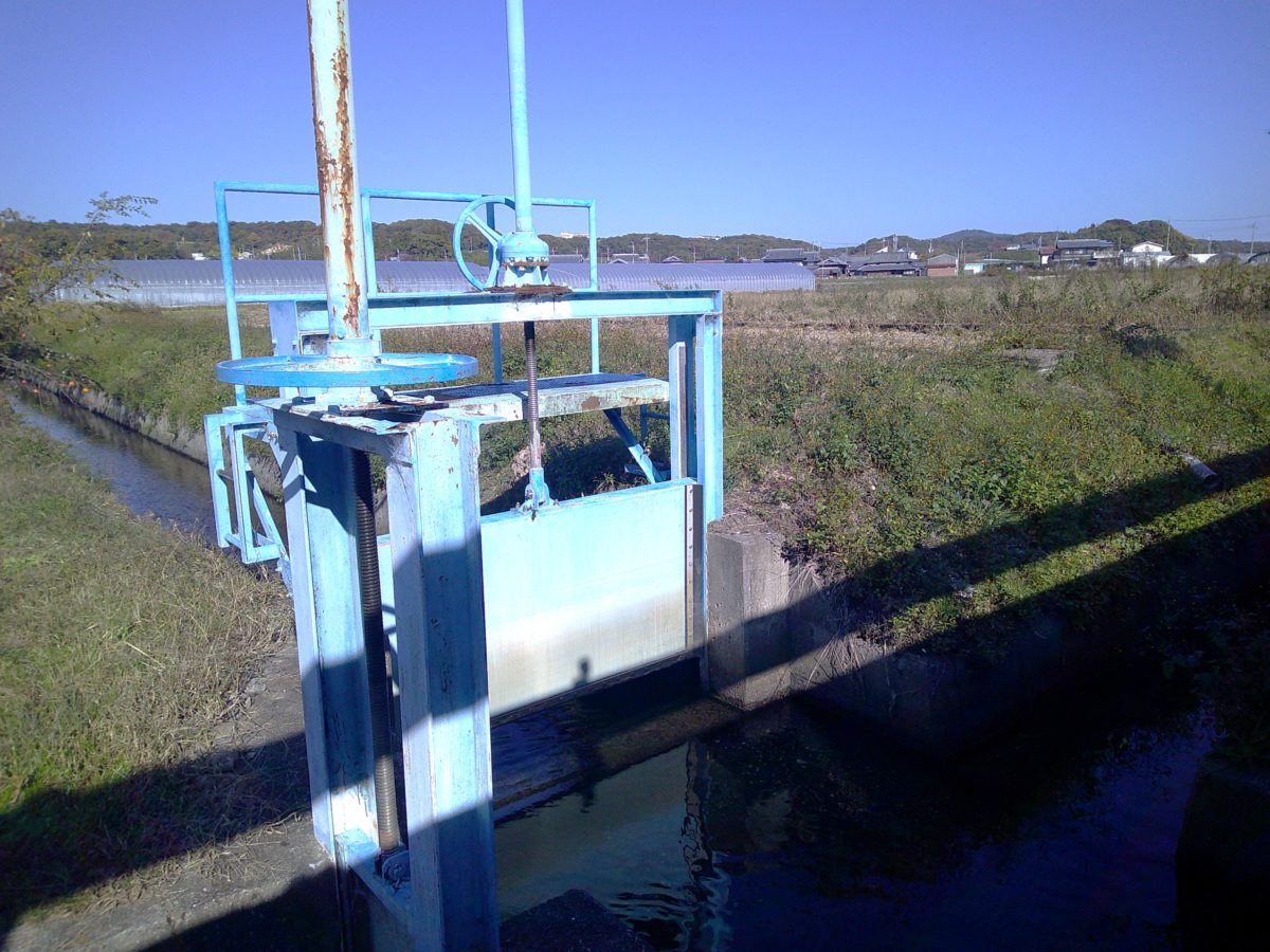 林崎掘割には西戸田の中湯(1658年設置)のほか、さらに上流の黒田(神戸市西区、1708年設置)にも取水口が設けられており、こちらは上湯と呼ばれています。中湯から数十メートルほど離れた地点で、上湯の水と中湯の水は合流します。合流地点には水量調整のためのゲートが設けられていました。