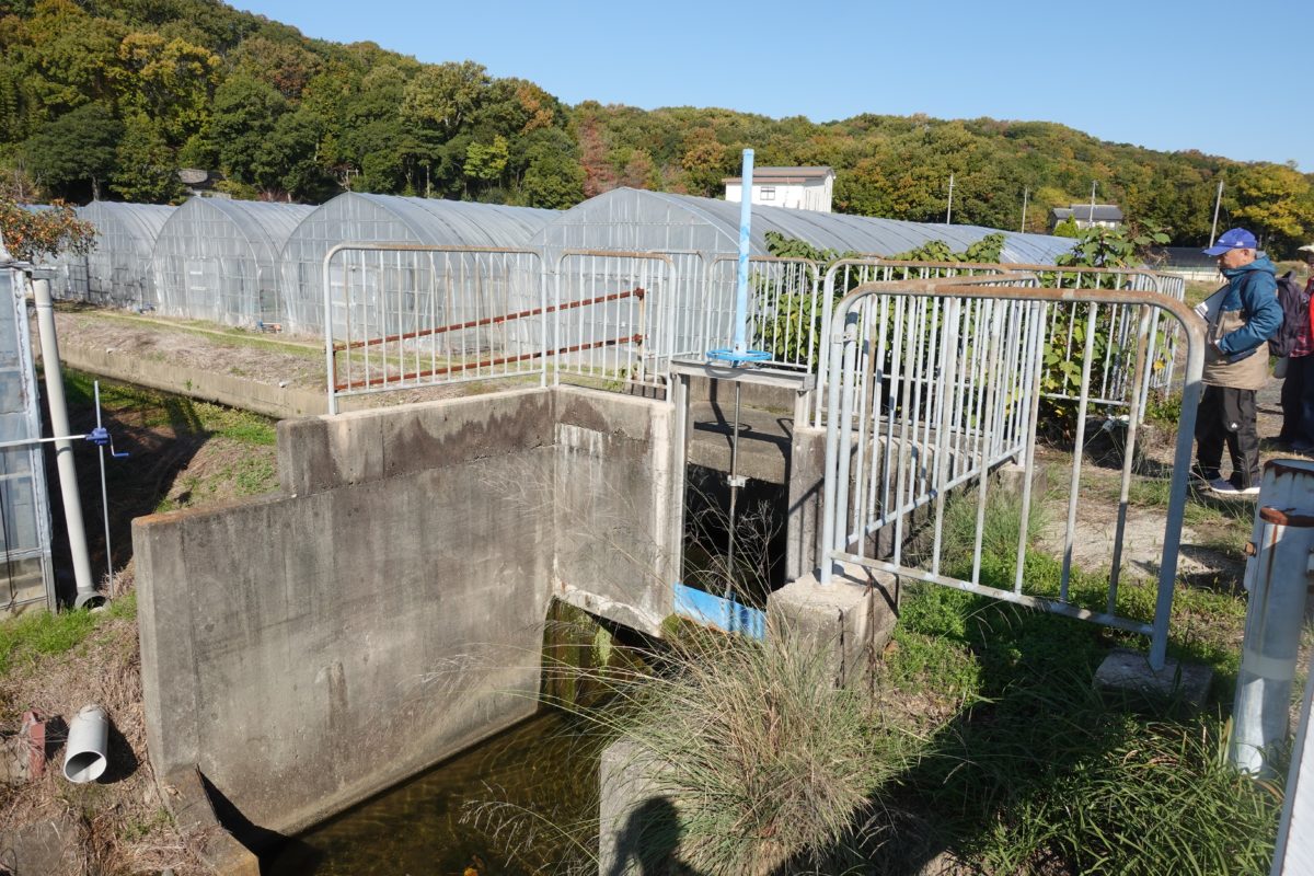 秋晴れの好天の下、JR明石駅に集合した一行はバスで西戸田(神戸市西区平野町)に移動。まずは明石川(江戸時代には押部川とも呼ばれた)に設けられた取水口「中湯(中湧井堰)」を見学しました。中湯は川に堰を設け、人工的に水位を増すことで掘割(水路)に導水する仕組みで、現在でも地域の人々によって大切に管理されています。
