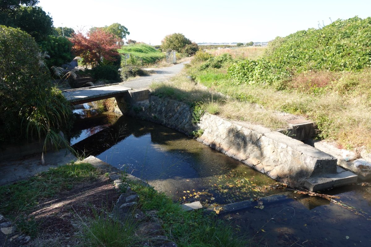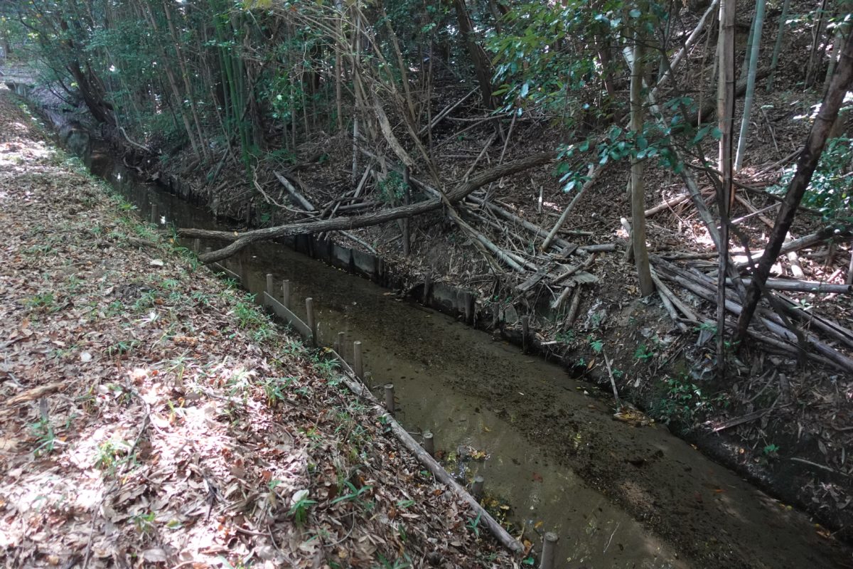 このあと、掘割は薮のなかに入り、江戸時代の掘割はかくもあったかと思わせるような道すじが続きます。途中には掘割の水を急勾配で切り落とし、丘陵の下に広がる田畑に流し込む「刎樋」という施設が見られ、流域の村々でも掘割の水が活用されていた様子がうかがえます。