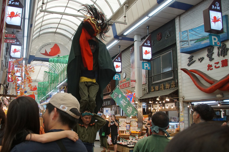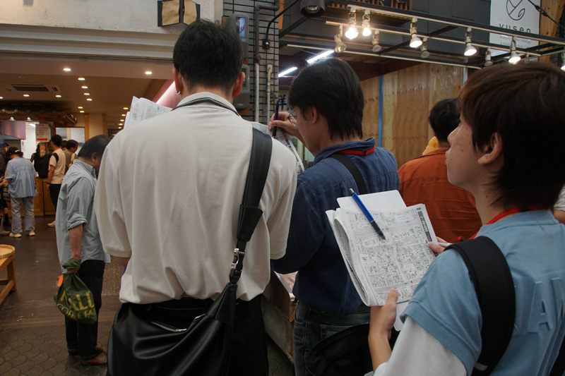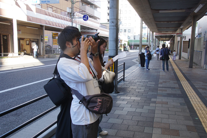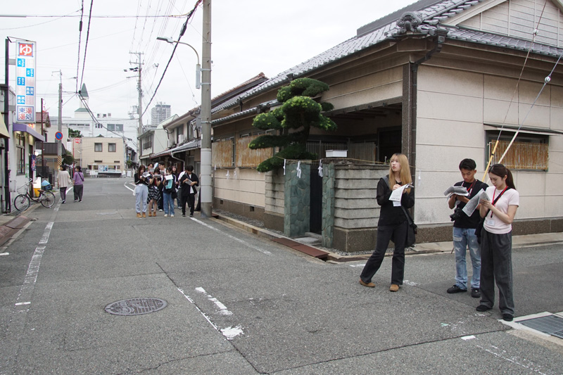 明石駅に集合し、旧ダイエー明石店跡に建設された再開発ビルのパピオスあかし前に設置されたフロアガイドで入居している公共施設や店舗事業所の構成について確認し、パピオスあかしが目指す都心に人を引き寄せようとする設計思想について考えました。続いて、観光客で賑わう魚の棚商店街に移動し、店舗の現状について班ごとに把握するとともに、稲爪神社秋例大祭で町回りをしていた大蔵谷獅子舞保存会の獅子舞を見学、撮影しました。その後、本町通り商店街の老舗煎餅店店主から中心市街地活性化対策の目玉施設である大衆演劇場明石本町三白館の整備経緯について話を伺った後、マンションが増え始めた同商店街の変化を住宅地図を用いて把握しました。その後、金物屋や荒物屋がみられた町並みが急速に失われつつある鍛治屋町や、簡易裁判所や司法事務所が立ち並ぶ相生町、宿場町であった大蔵本町付近で、現在の街並みと高度経済成長期の住宅地図との比較作業を行ったのち、人文学部・地域研究センターと連携している稲爪神社で解散しました。