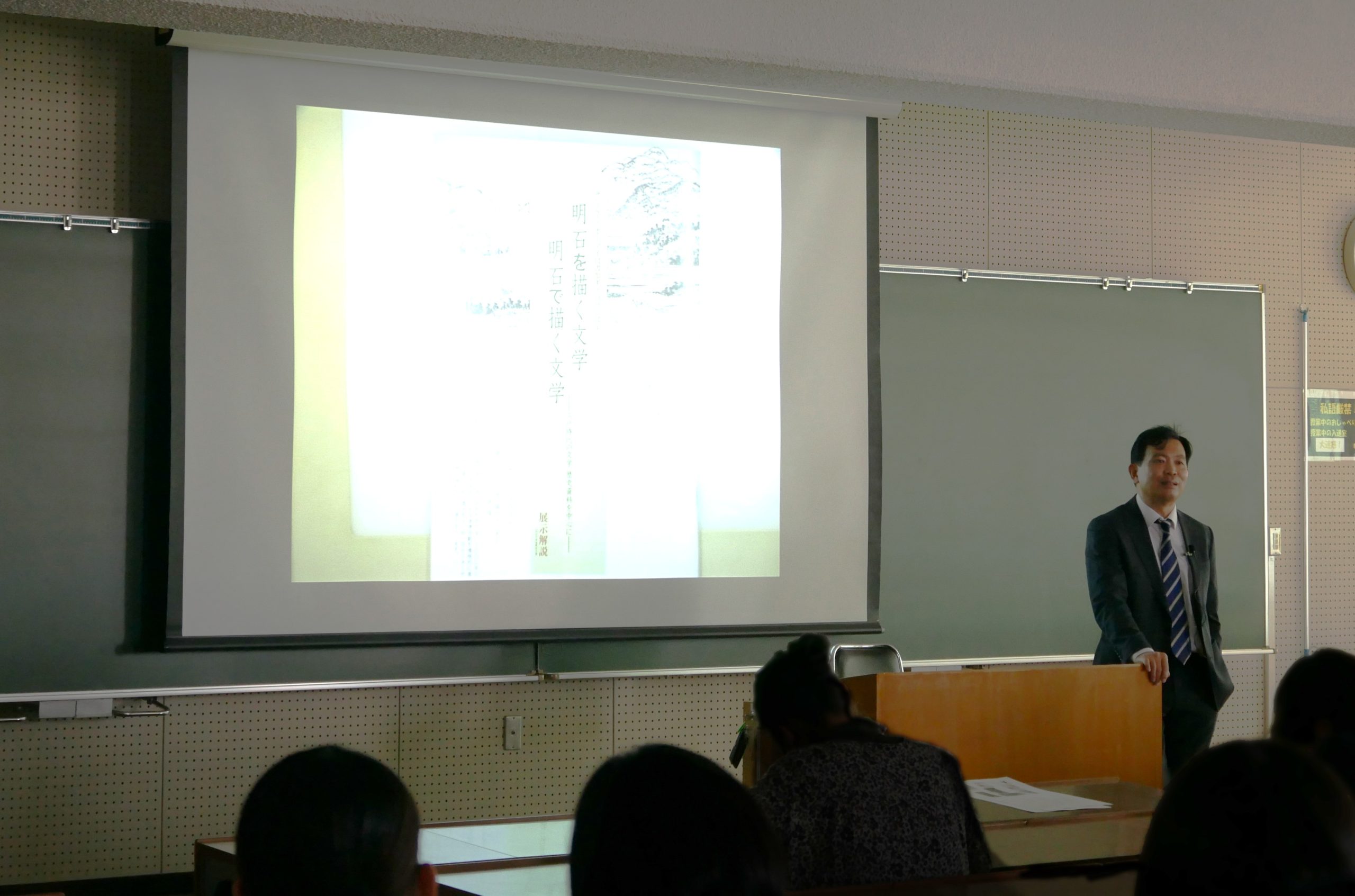 「明石を描く文学 明石で描く文学」は今年9月4日(木)から本学ポーアイ図書館で実施された展覧会です。好評のなか11月4日(火)に閉幕しましたが、ポートアイランドキャンパスでの展示であったため、有瀬キャンパスに所属する学生の多くは参観の機会に恵まれなかったようです。そこで地域研究センター(人文学部)の中村准教授の発案により、展示物を有瀬キャンパスに運び、人文学部生向けの特別展覧を実施することになりました。当日は100人近い学生が参加し、教室は思わざる賑わいを見せました。