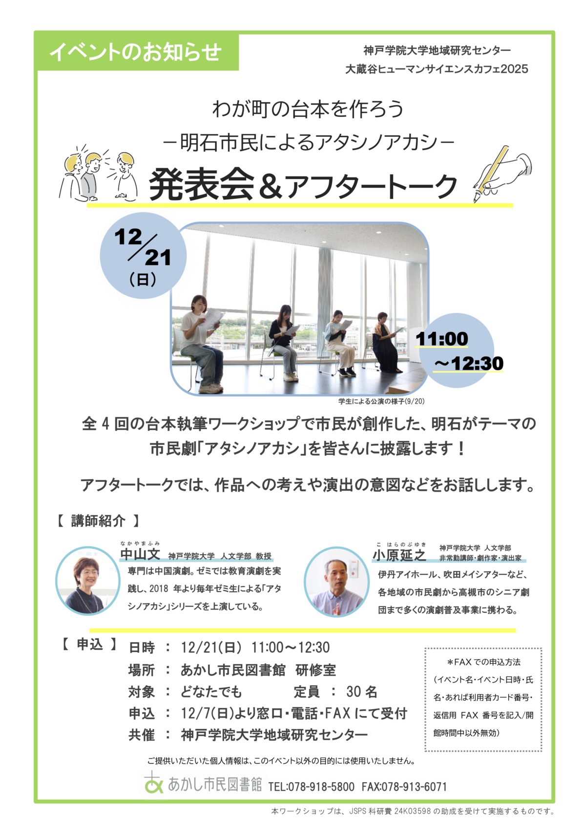 12月21日(日)、地域研究センターでは、あかし市民図書館と共催のかたちで大蔵谷ヒューマンサイエンスカフェ2025・『わが町の台本を作ろう -明石市民によるアタシノアカシ-』発表会を開催いたします。