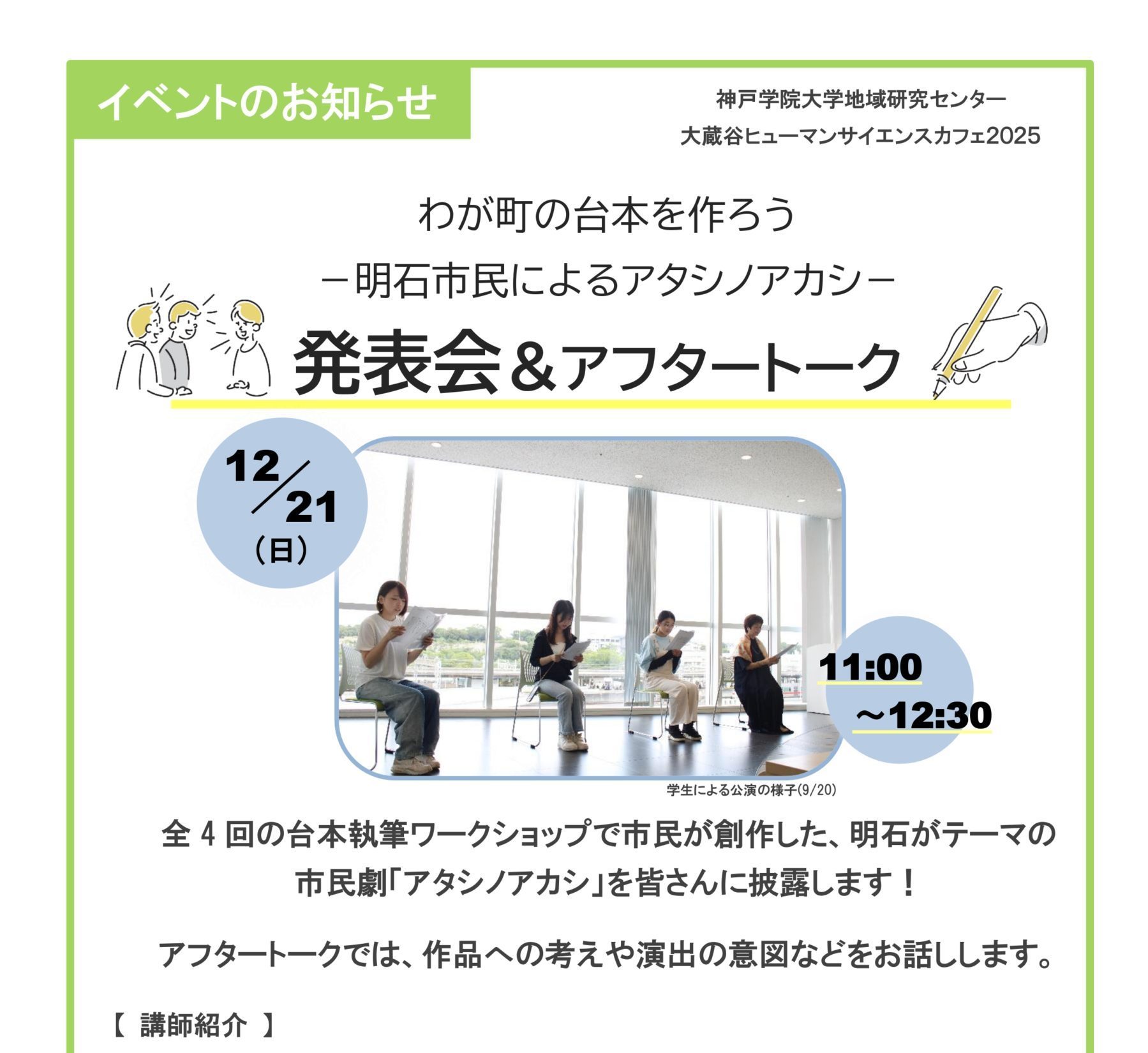 12月21日(日)、地域研究センターでは、あかし市民図書館と共催のかたちで大蔵谷ヒューマンサイエンスカフェ2025・『わが町の台本を作ろう -明石市民によるアタシノアカシ-』発表会を開催いたします。