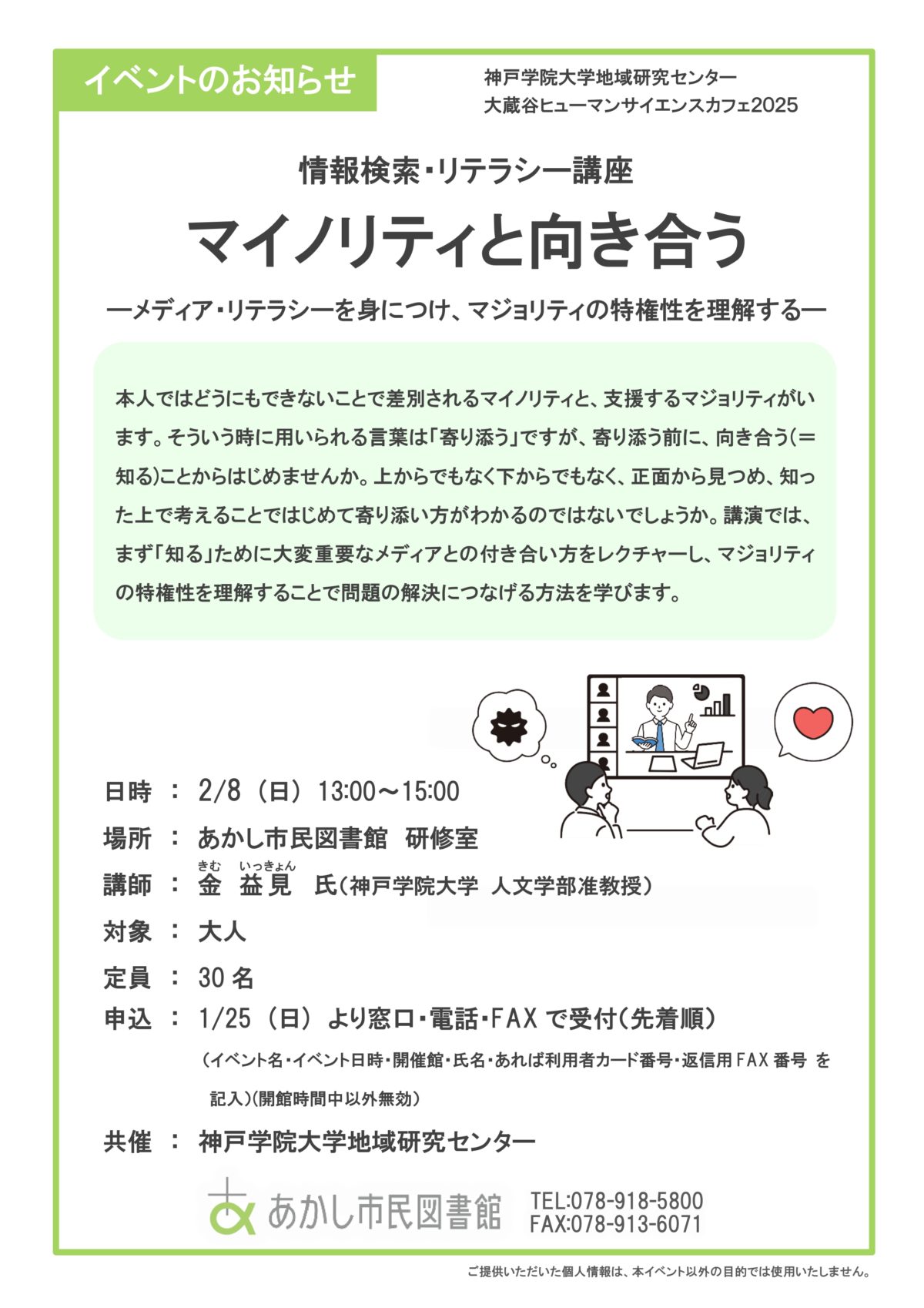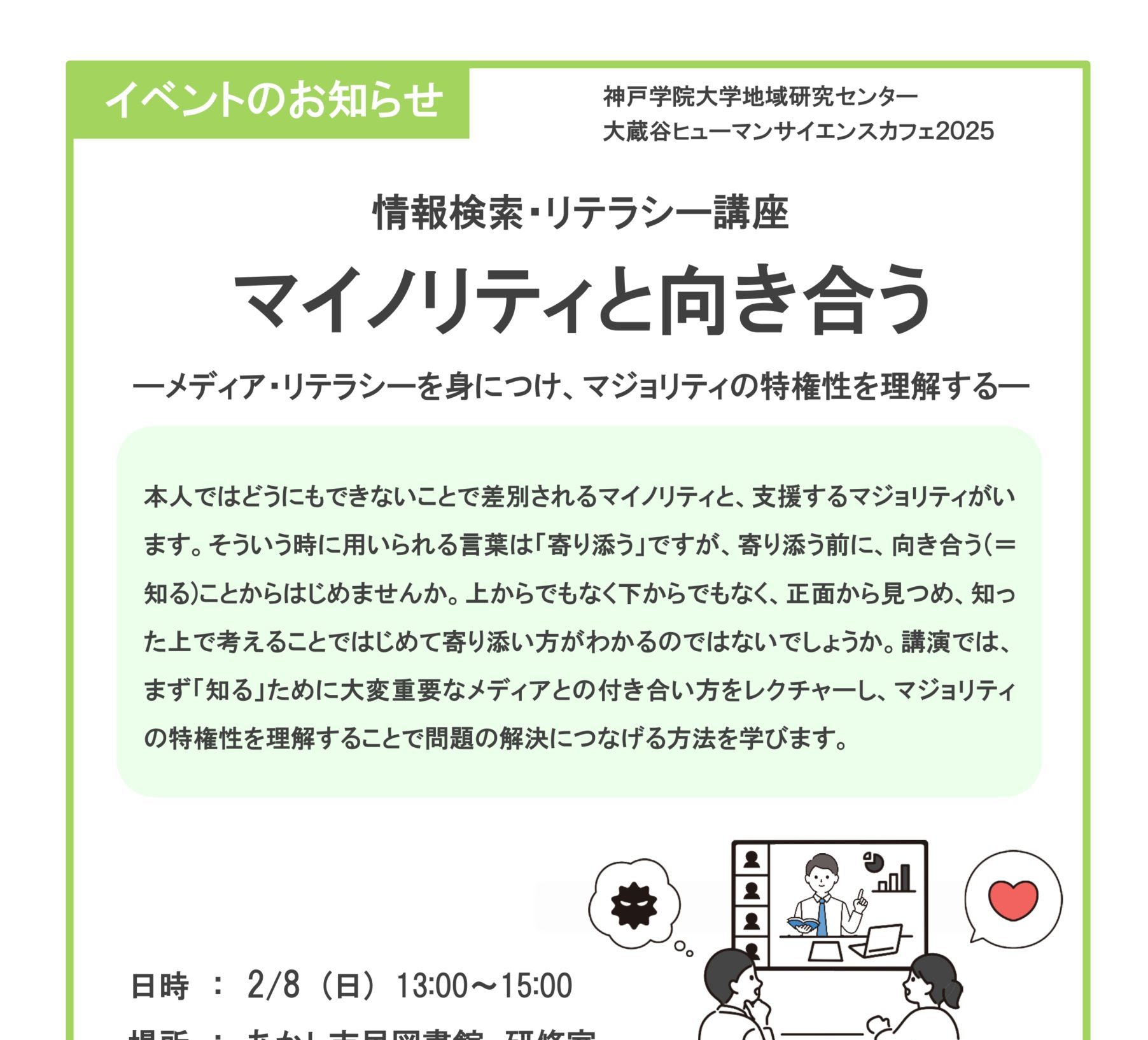 大蔵谷ヒューマンサイエンスカフェ2025 開催のお知らせ。2/8(日) お知らせ 2026.01.20 2026年2月8日(日)、地域研究センターでは、あかし市民図書館と共催のかたちで「大蔵谷ヒューマンサイエンスカフェ2025」を実施いたします。 詳細は↓チラシをご覧ください。