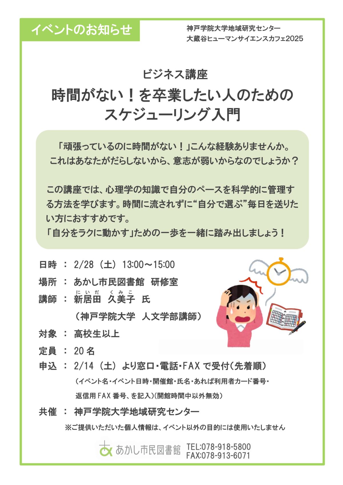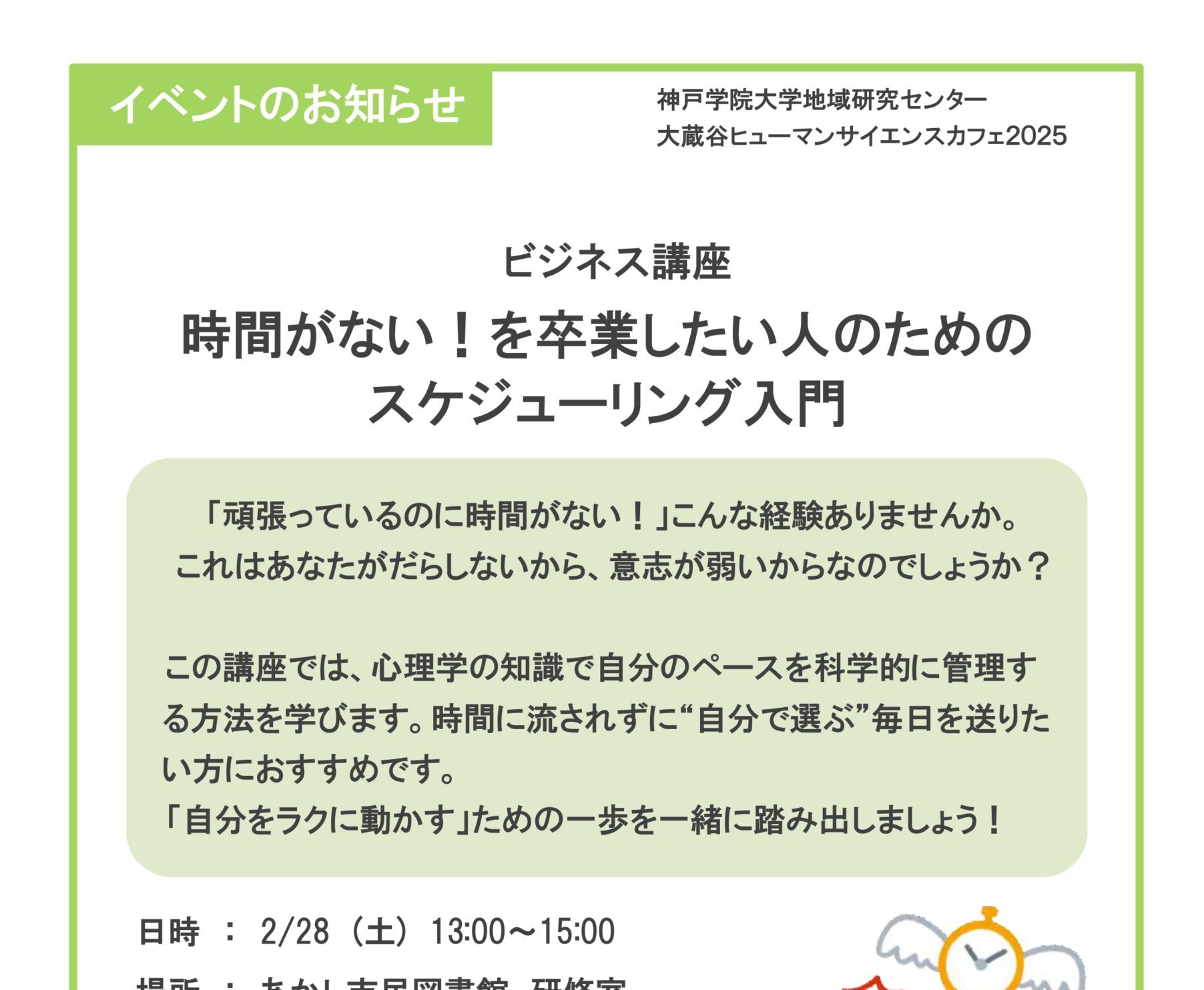 大蔵谷ヒューマンサイエンスカフェ2025 開催のお知らせ。2/28 お知らせ 2026.01.27 2026年2月28日(土)、地域研究センターでは、あかし市民図書館と共催のかたちで「大蔵谷ヒューマンサイエンスカフェ2025」を実施いたします。 詳細は↓チラシをご覧ください。