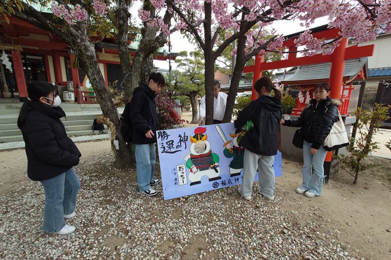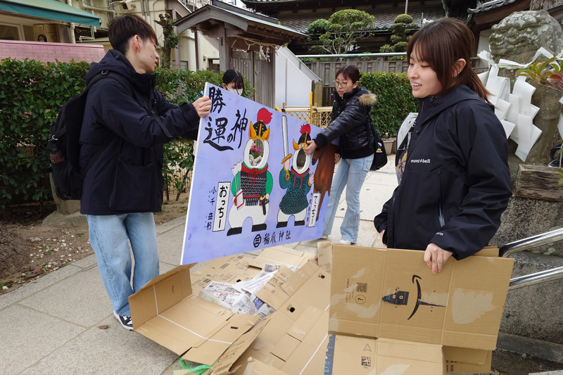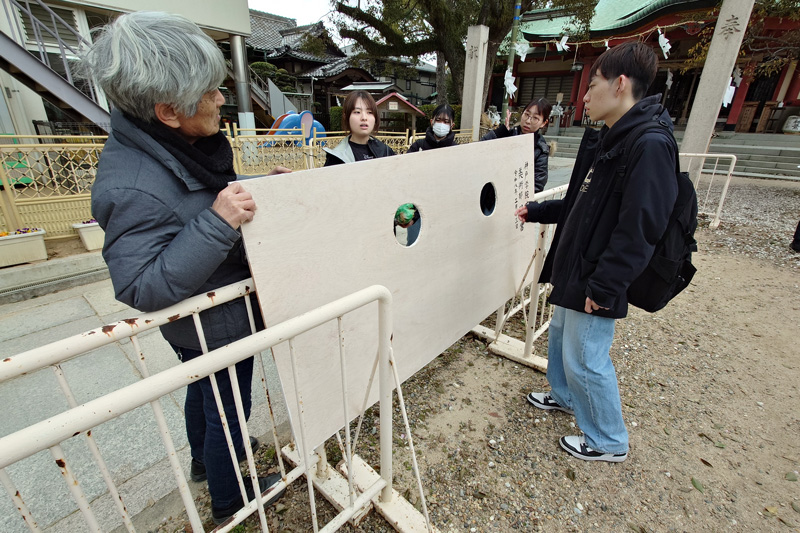 本学美術部では、稲爪神社の菅谷誠夫宮司からの要請を受けて、神社に伝わる推古天皇の頃の由緒に登場する異国から攻めてきた鉄人の顔出しパネルを制作して、2023年3月に奉納しました(https://card-kobegakuin.jp/inazume-bijutsubu-2023-03-02/)。同神社の菅谷宮司から、この顔出しパネルは大人が顔を出すことを想定して制作したものの、子どもに人気があるので、地域研究センター研究員の人文学部矢嶋教授が、子ども向けのパネルを美術部に制作してもらえないかとの相談を再び受けて、学生支援センターを通じて美術部鷗風會部長(当時)の安井葵咲さん(心理学部3年)に相談したところ、部として是非引き受けたいということとなり実現しました。多くの部員が制作に関わってパネルが完成し、3月13日に、安井さん、現部長の大橋美紀さん、田中もえさん、成瀬照真さん(いずれも人文学部2年)によって神社に奉納されました。翌日の稲爪保育園の卒園式で子どもたちが顔を出せるように、菅谷宮司と氏子が早速境内に設営しました。