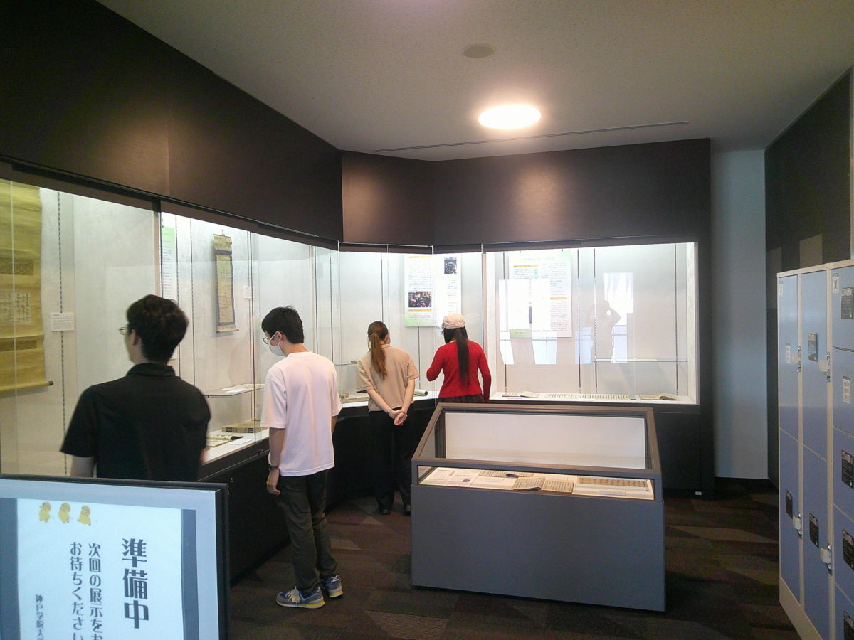 本展示に関しては人文学部の中村健史准教授(国文学、地域研究センター研究員)、曽我部愛准教授(日本史)、白方佳果講師(日本文学)が企画にあたり、展示物の選定、解説の作成などを行いました。また、9月1日(月)には中村ゼミ所属の学生がポートアイランドキャンパスに集まり、実際の展示作業にあたるなど、人文学部・地域研究センターを中心に作業を進めてきました。