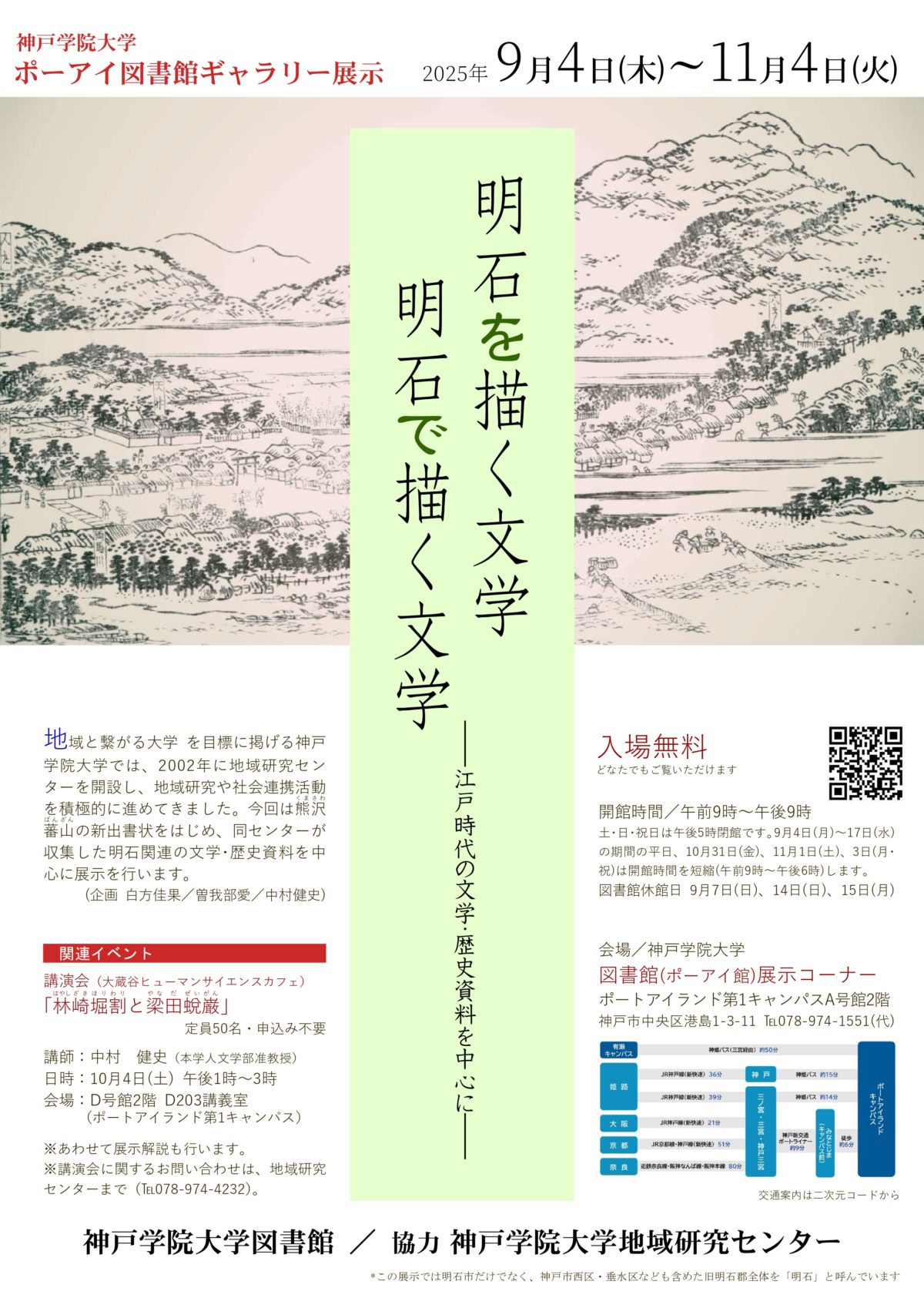 本学ポーアイ図書館展示コーナーにおいて、9月4日(木)からギャラリー展示「明石を描く文学 明石で描く文学 ―江戸時代の文学・歴史資料を中心に―」が開催されます。