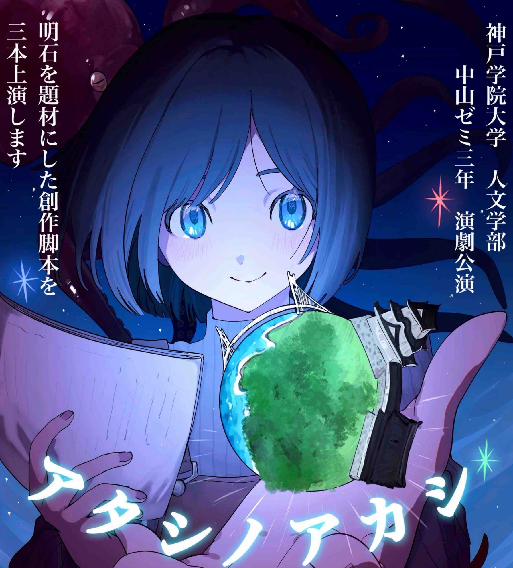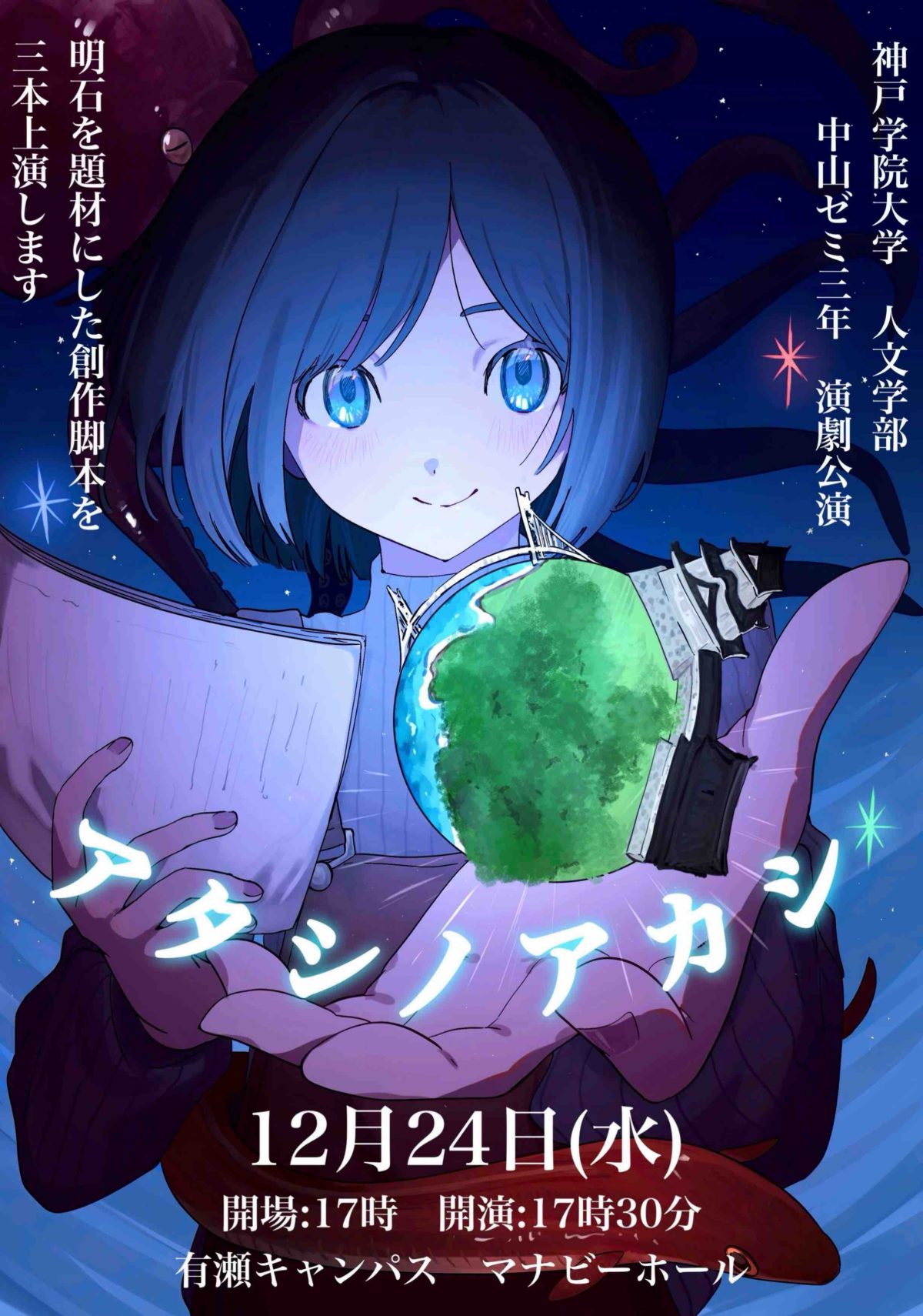 創作演劇プロジェクト「アタシノアカシ」上演のお知らせ 12/24 お知らせ 2025.12.10 神戸学院大学人文学部中山ゼミでは2016年より、学生による戯曲制作・上演を行ってきました。プロの劇作家の指導をうけて、「明石」をテーマに学生たちが戯曲を創作し、自ら上演する創作演劇シリーズ「アタシノアカシ」、今年は12月24日に上演します。 学生たちのみずみずしい感性と情感たっぷりの演技を、どうぞお楽しみください。 場所:マナビホール (神戸学院大学有瀬キャンパス)時間:2025年12月24日(水)17:00開場/17:30開演 入場無料